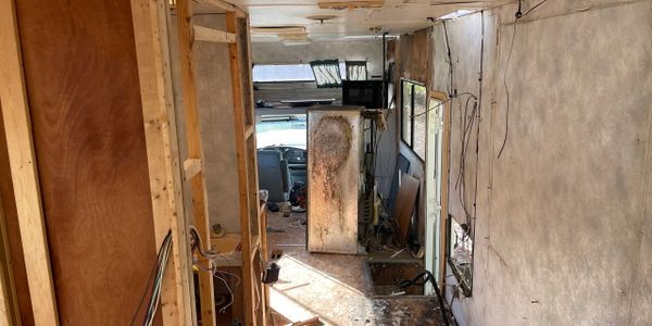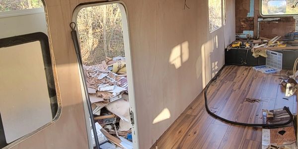 This image documents the early stage of Milpa Móvil, when the RV was fully gutted to address water damage and structural issues. Removing damaged materials allowed us to assess the condition of the space and begin necessary repairs, laying the foundation for a safe, sustainable, and intentional living and working environment.